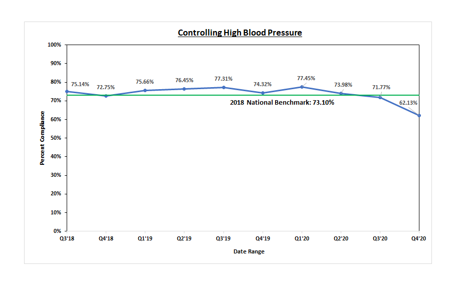 This graph shows the percentage of our patients with a diagnosis of hypertension who have a blood pressure less than 140/90. For the past several years, MetroHealth has adopted best practices in team-based care to help patients better control their high blood pressure, and we now proudly exceed the national benchmark.
