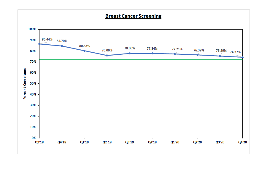 In September of 2017, we began offering a new method for colorectal cancer screening, the Fecal Immunochemical Test or “FIT”. We now offer our patients the choice of FIT or colonoscopies as options to prevent or detect cancer. Beginning last year, our rate of screening for adults between the ages of 50 and 75 has increased each month, and we now exceed the national benchmark.