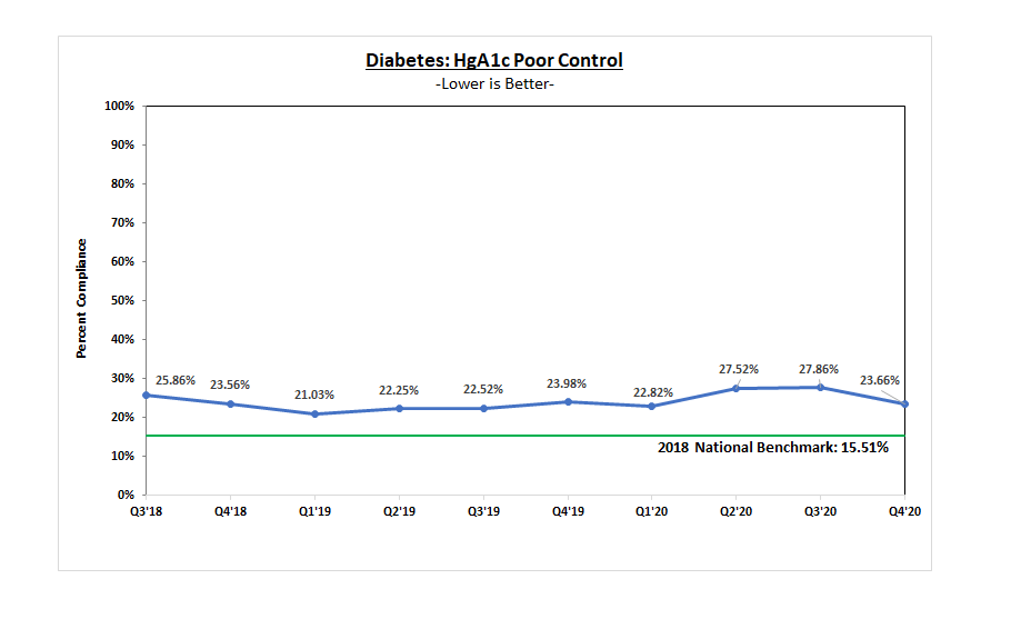 This measure shows the percentage of patients with diabetes who either have high blood sugar levels or have not received recommended testing in the past year. We have made great strides in improving these results, but still have an opportunity to help more patients with diabetes better manage their blood sugars with consistent testing, healthy eating, exercise, and, in many cases, medications.