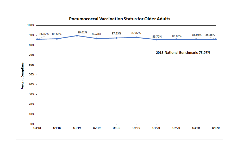 This graph shows the percentage of patients 65 years of age and older who have received the pneumococcal vaccine. In 2018, we reached an all-time high rate of vaccinating more than 80 percent of patients, protecting them from the potentially serious complications of pneumonia.